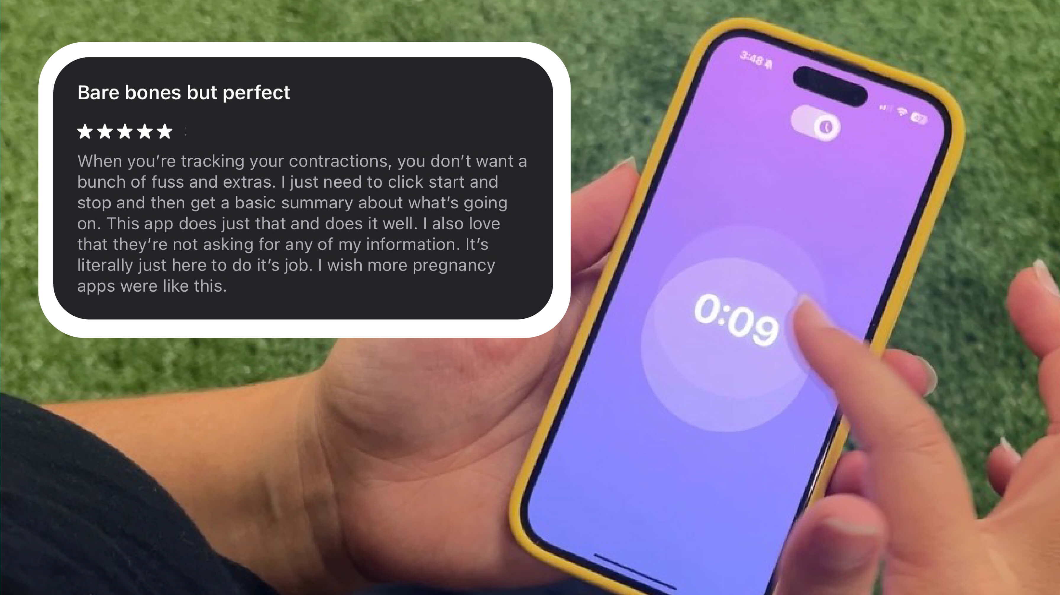 Download our free iPhone contraction timing app, designed in partnership with a two-time Apple Design Award–winning developer (who also happens to be our founder's brother). Because in labor, how something feels matters as much as what it does.